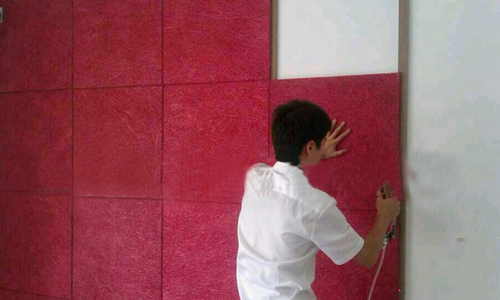 用力邦或多樂士、典彩乳膠漆加適量的水用噴槍將涂料直接噴在板材上,一般連續來回兩 三遍即可。保持所有地方都能夠均勻上色且不要噴的太厚以免影響吸聲效果。